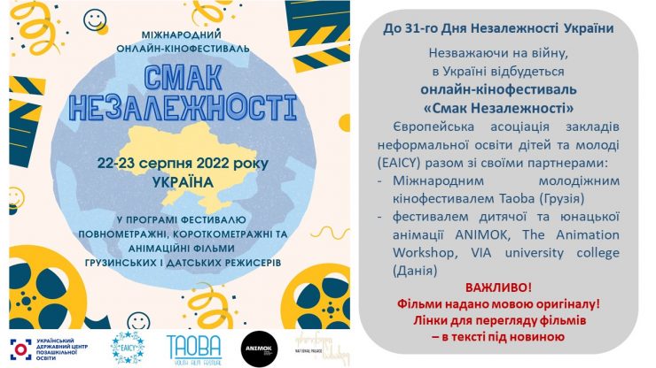 Міжнародний Онлайн Кінофестиваль “Смак Незалежності” Запрошуємо до переглядів! Фестивальні покази з метою безпеки відбуваються онлайн 22 та 23 серпня за посиланням https://taste-of-independence.jwpapp.com/ 22.08.2022 – Для молоді та дорослих ● Послухай тишу (Грузія, 2016, 80′). Режисер: Маріам Чачія ● The Odd Sound Out (Данія, 2013. 6′). Фестиваль дитячої та юнацької анімації АНІМОК ● Parrot Away (Данія, […]