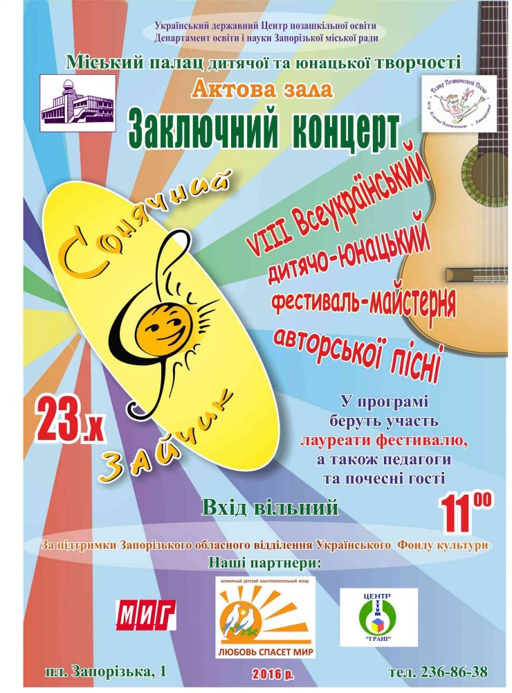 21-23 жовтня 2016 року у Запорізькому міському Палаці дитячої та юнацької творчості відбувся VIІI Всеукраїнський відкритий дитячо-юнацький фестиваль-майстерня авторської пісні «Сонячний зайчик», організований Українським державним центром позашкільної освіти за підтримки Запорізької організації НСЖУ. Партнерами фестивалю виступили: Запорізьке обласне відділення Українського фонду культури, Всесвітній дитячий фонд «Любов врятує мир», Центр технічної творчості учнівської молоді «Грані», тижневик […]